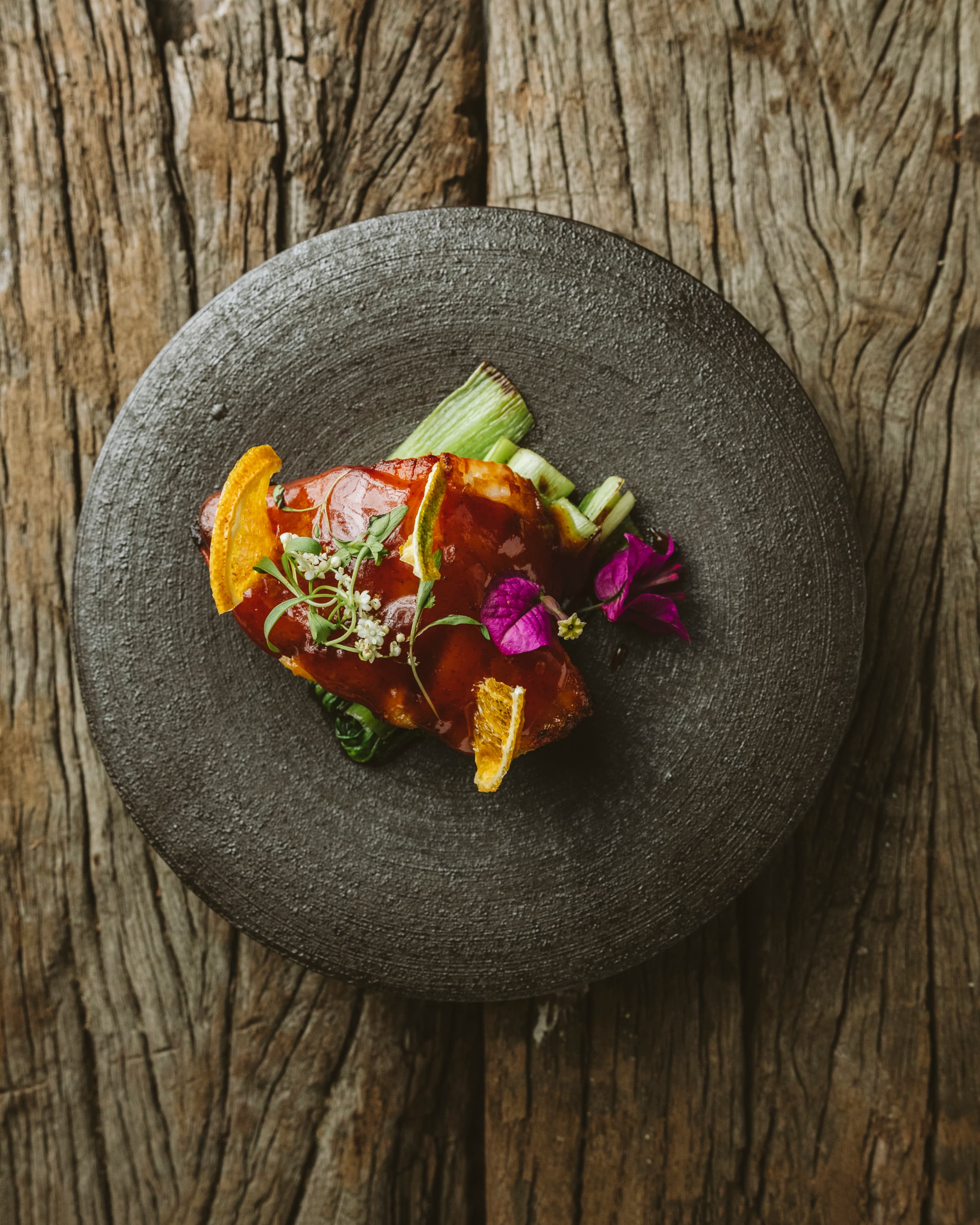 Robata grilled sea bream crowned with garlic chips, micro shiso and Maldon salt, served with ponzu yuzu.