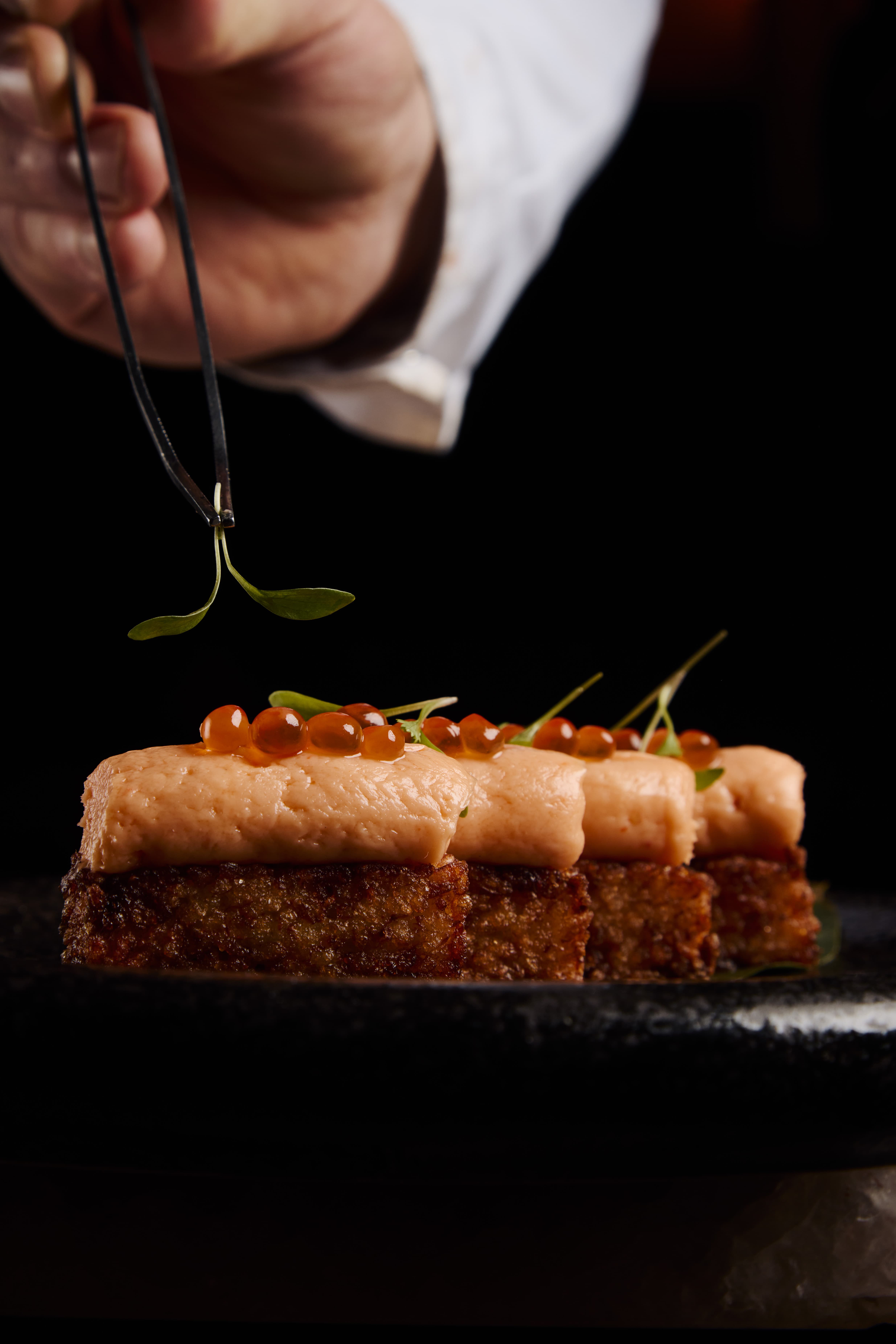 Salmon tiradito, gochujang powder, miso, yuzu vinegar and micro shiso.