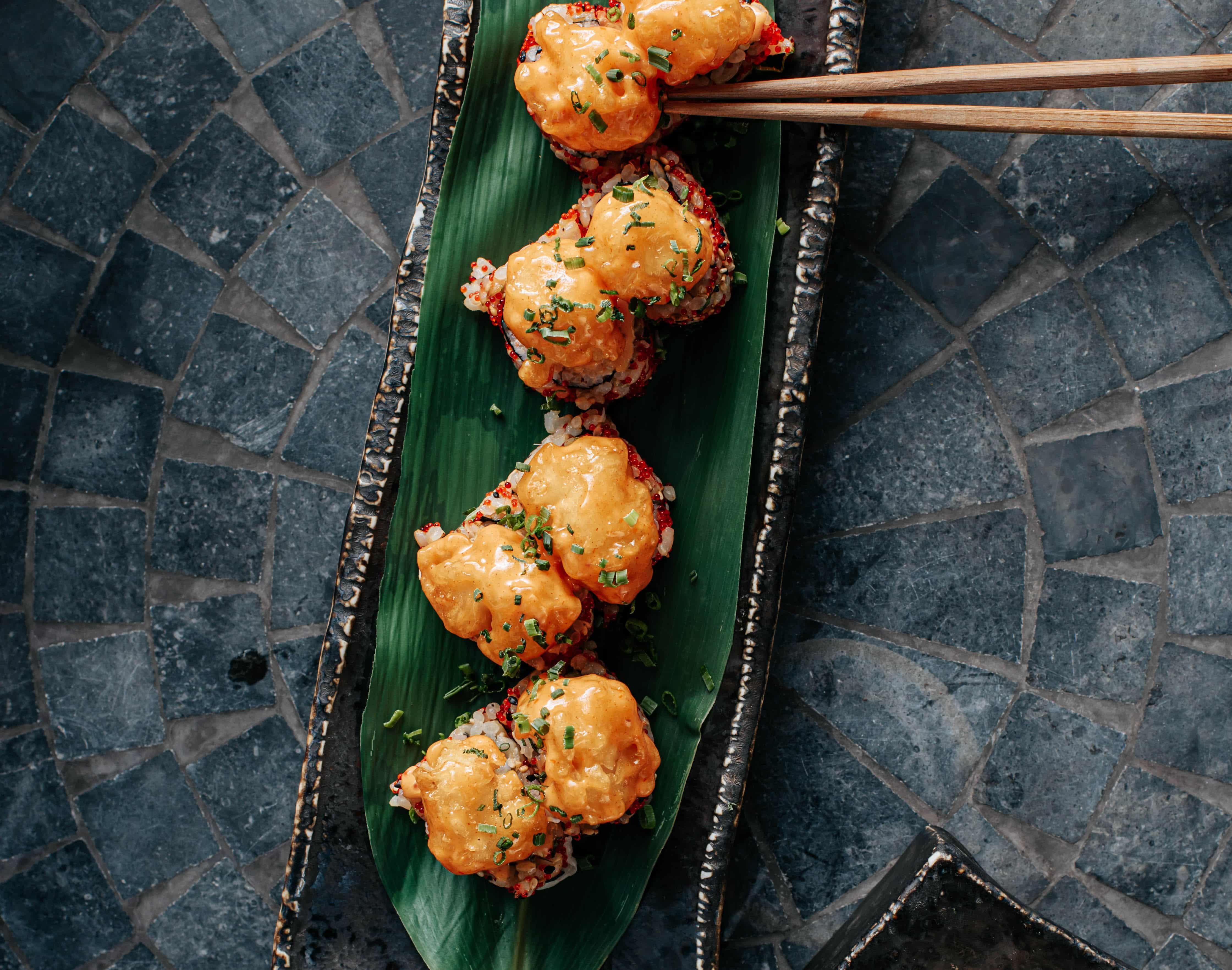 Maki filled with Norwegian salmon, scallions, and avocado, tempura-battered and topped with bluefin tuna. 5 pcs.