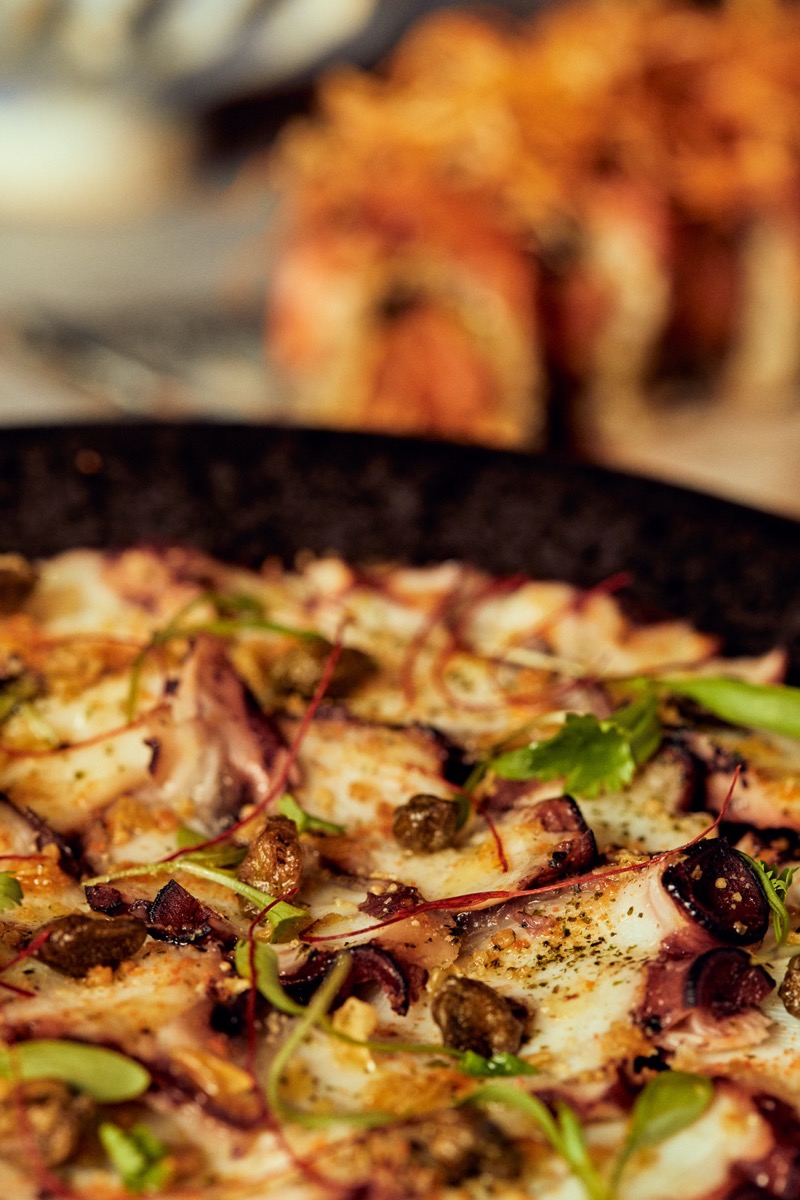 Crispy corn tortilla base with olive tapenade, fresh tuna, avocado, cherry tomato, red onion, micro cilantro, and a mix of sauces: gochujang, ponzu mayo, and anchovy mayo.