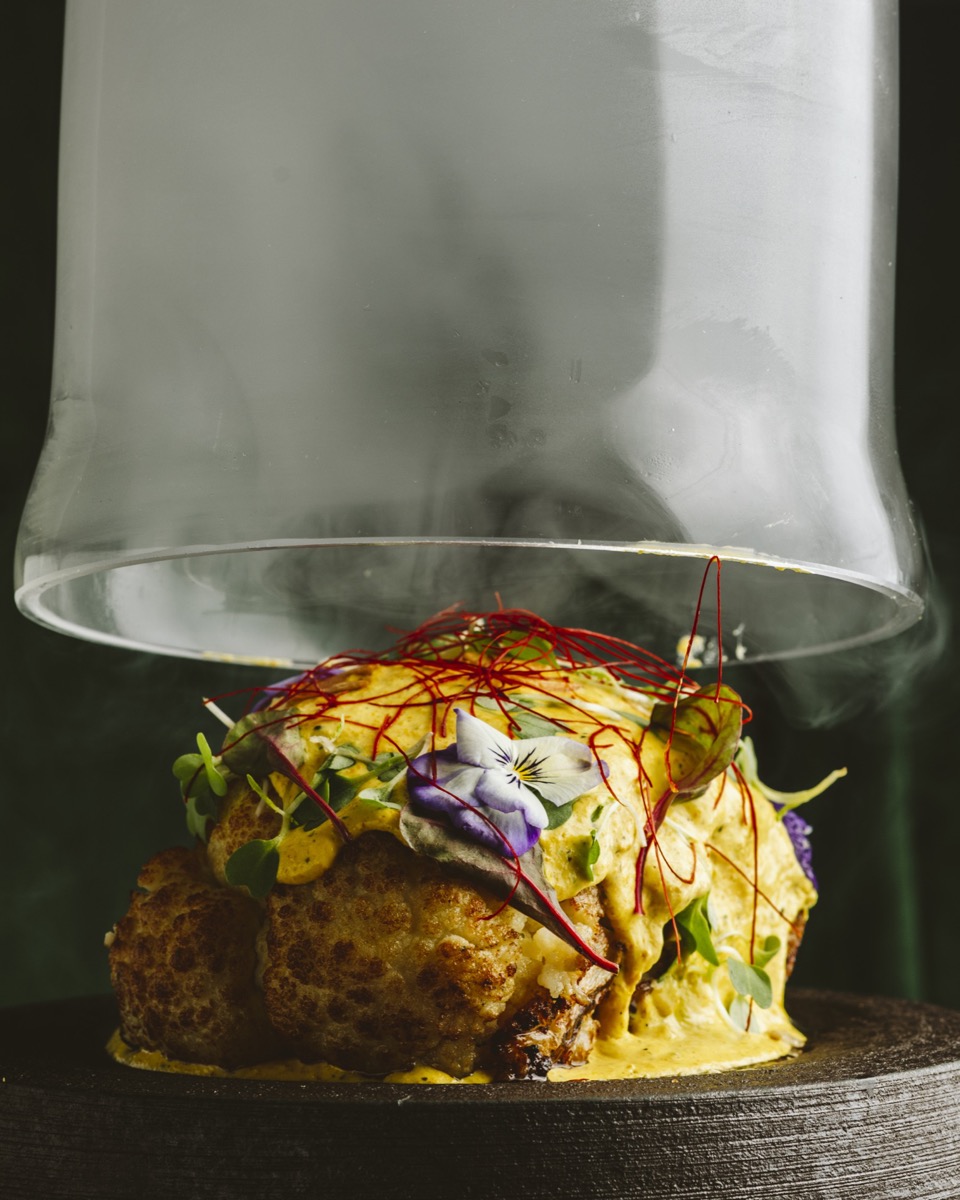 Cauliflower with smoked cauliflower coulis, yellow ají sauce and feta-tofu sauce.
