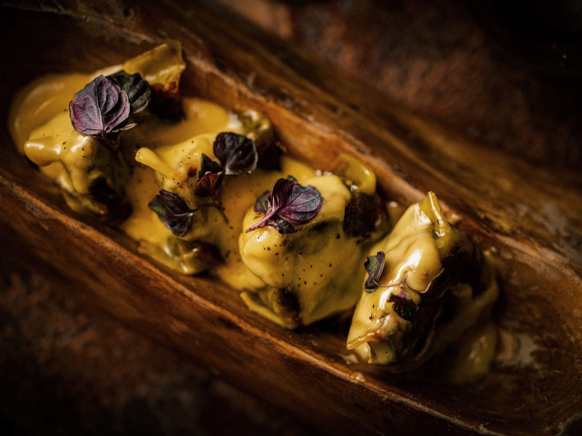 Stuffed with sautéed red chard, avocado and asparagus with A5 wagyu tartar topping and chilli sauce. 8 pcs.