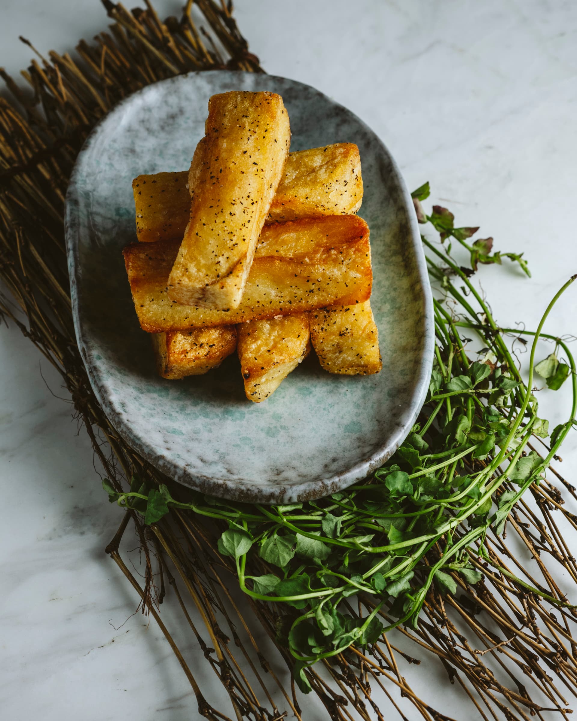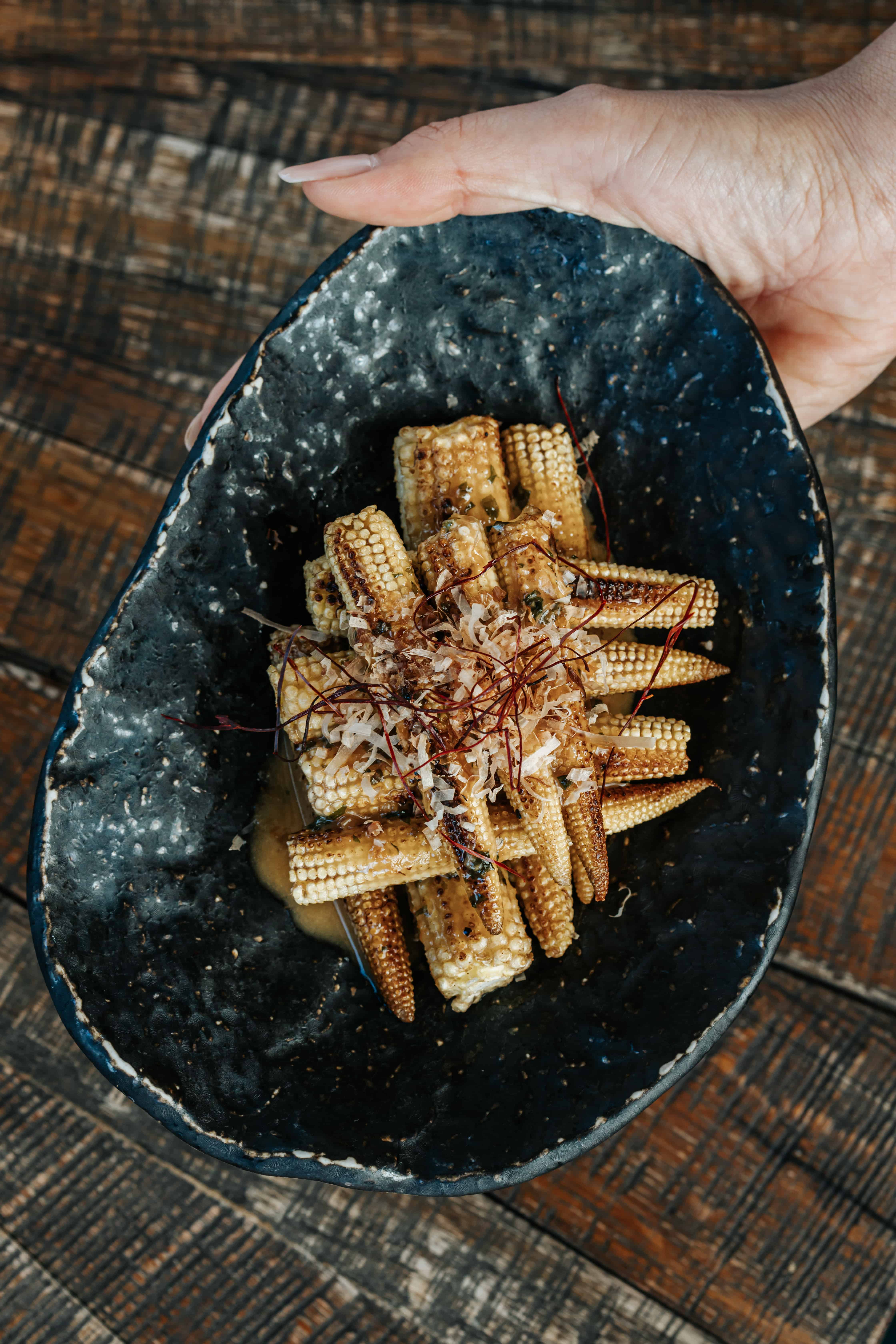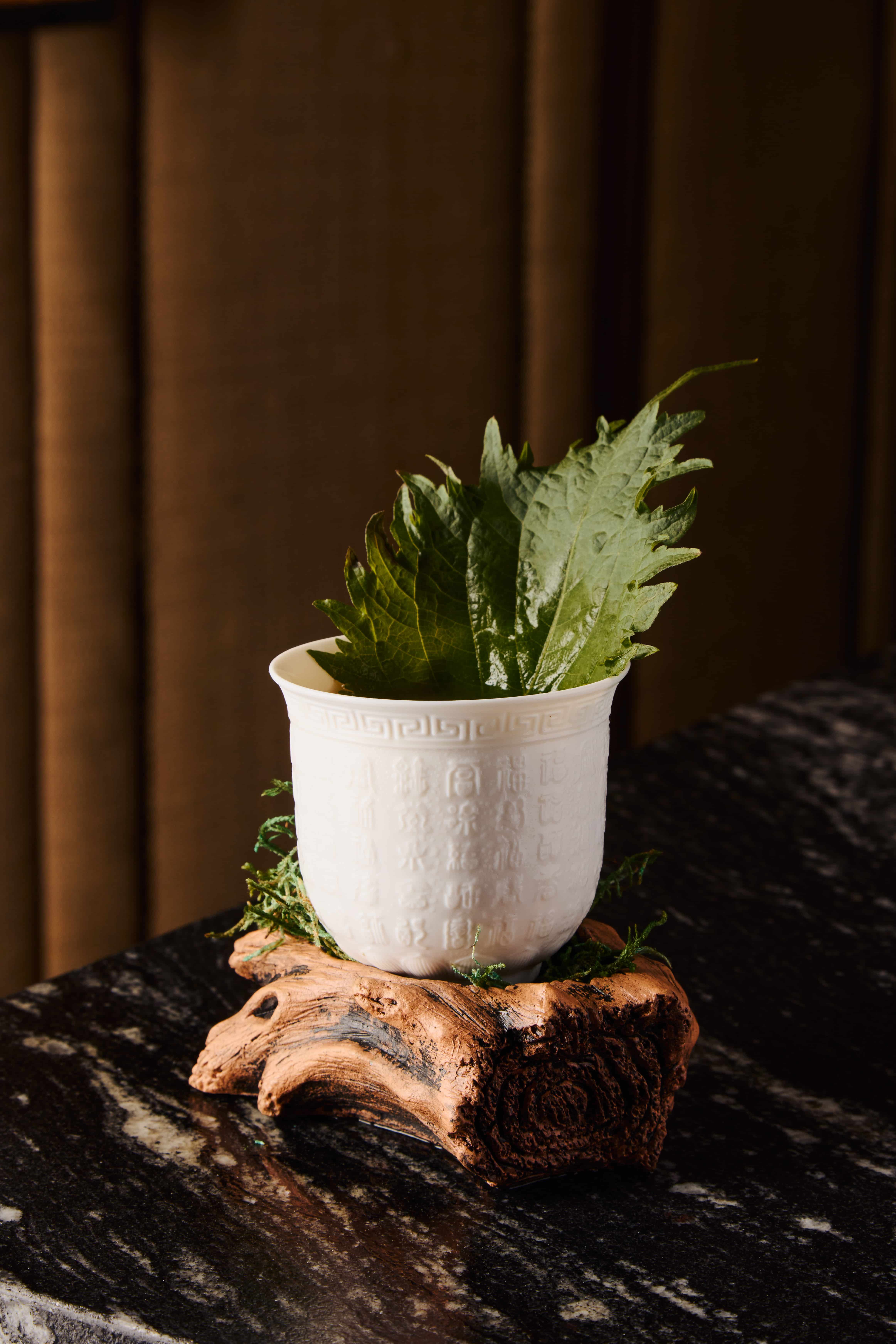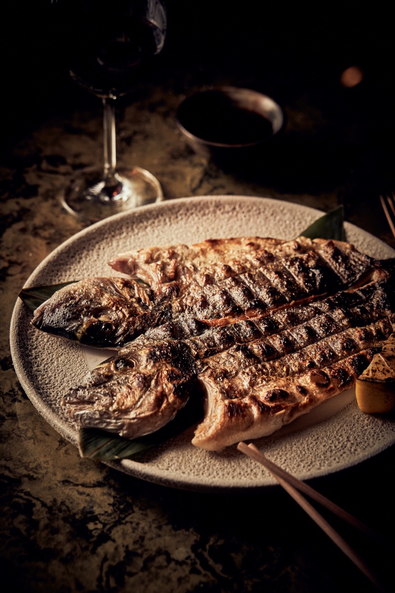Robata grilled sea bream crowned with garlic chips, micro shiso and Maldon salt, served with ponzu yuzu.