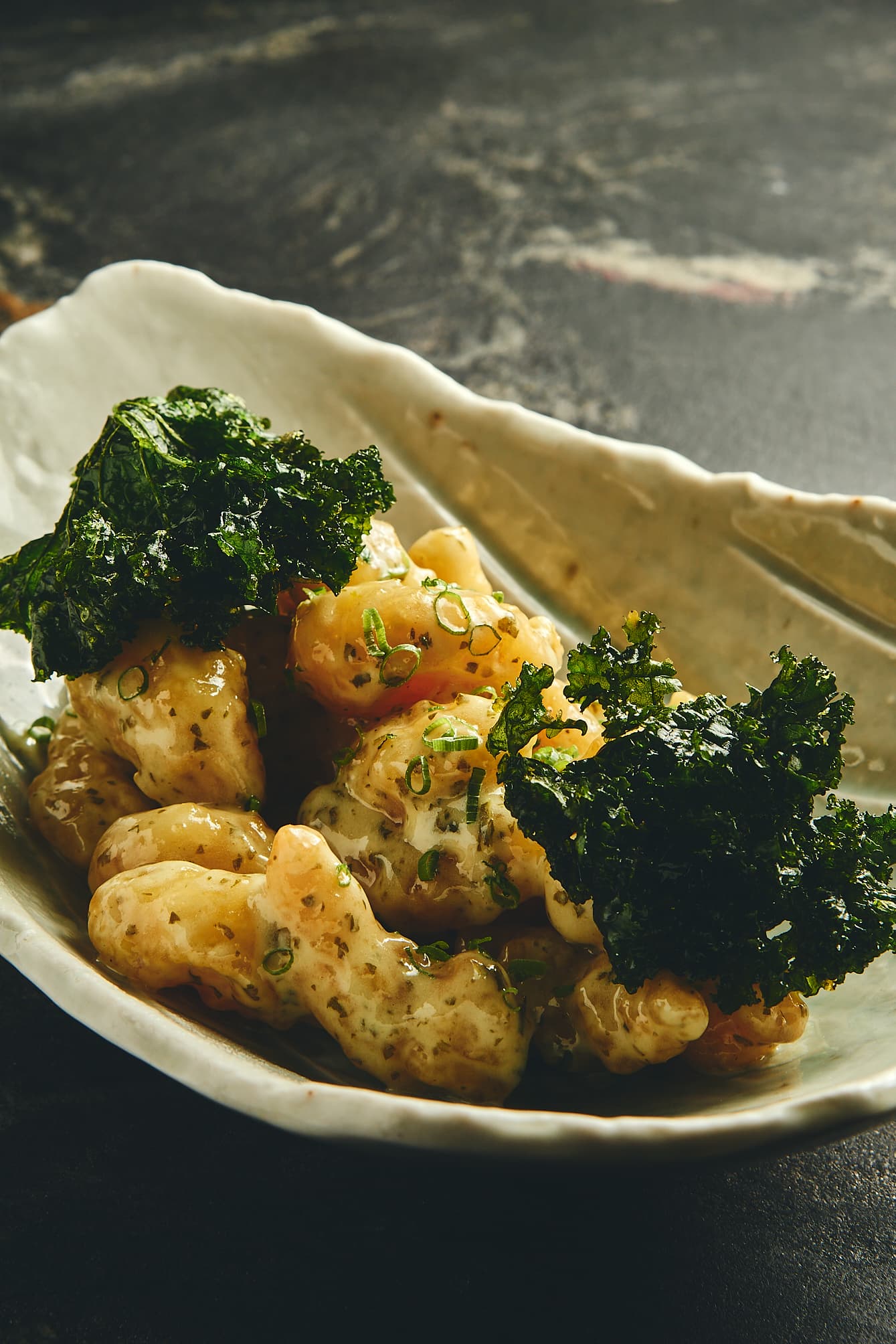 Tempura rock shrimps with wasabi, fried kale and green onions.