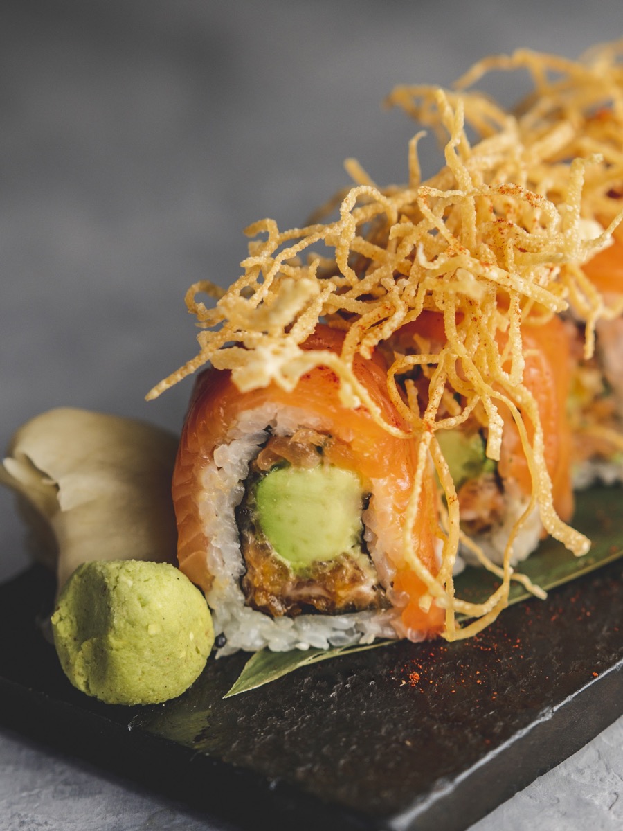 Salmon, chives, spicy mayo and avocado, with salmon topping, crispy wonton, and passionfruit and eel seasoning.
