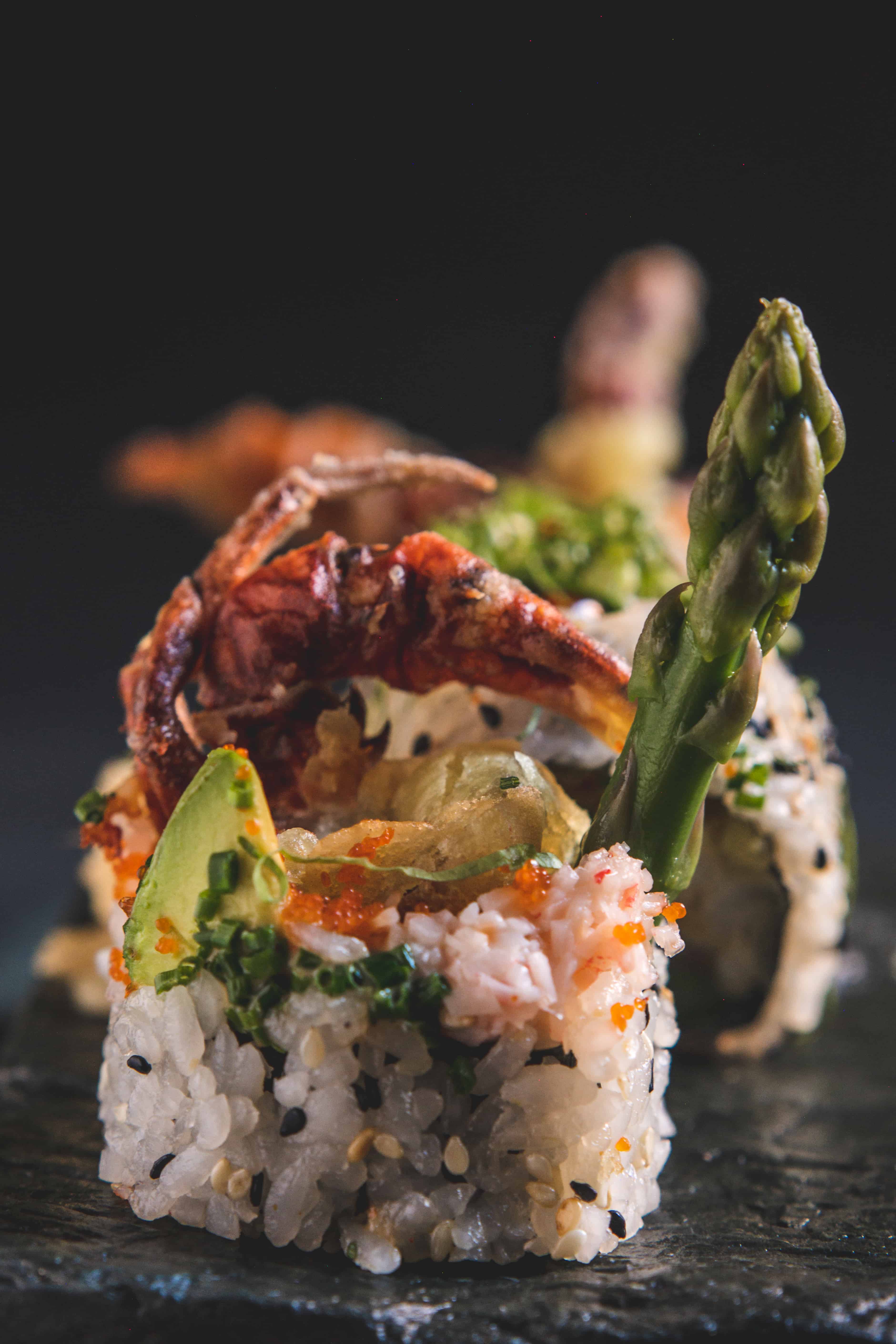 Roll of snow crab mix with asparagus, sesame, orange tobiko mix, mayo tobanjan sauce with chinese onion, avocado and lettuce, topped with marinated ikura. 5 pcs.