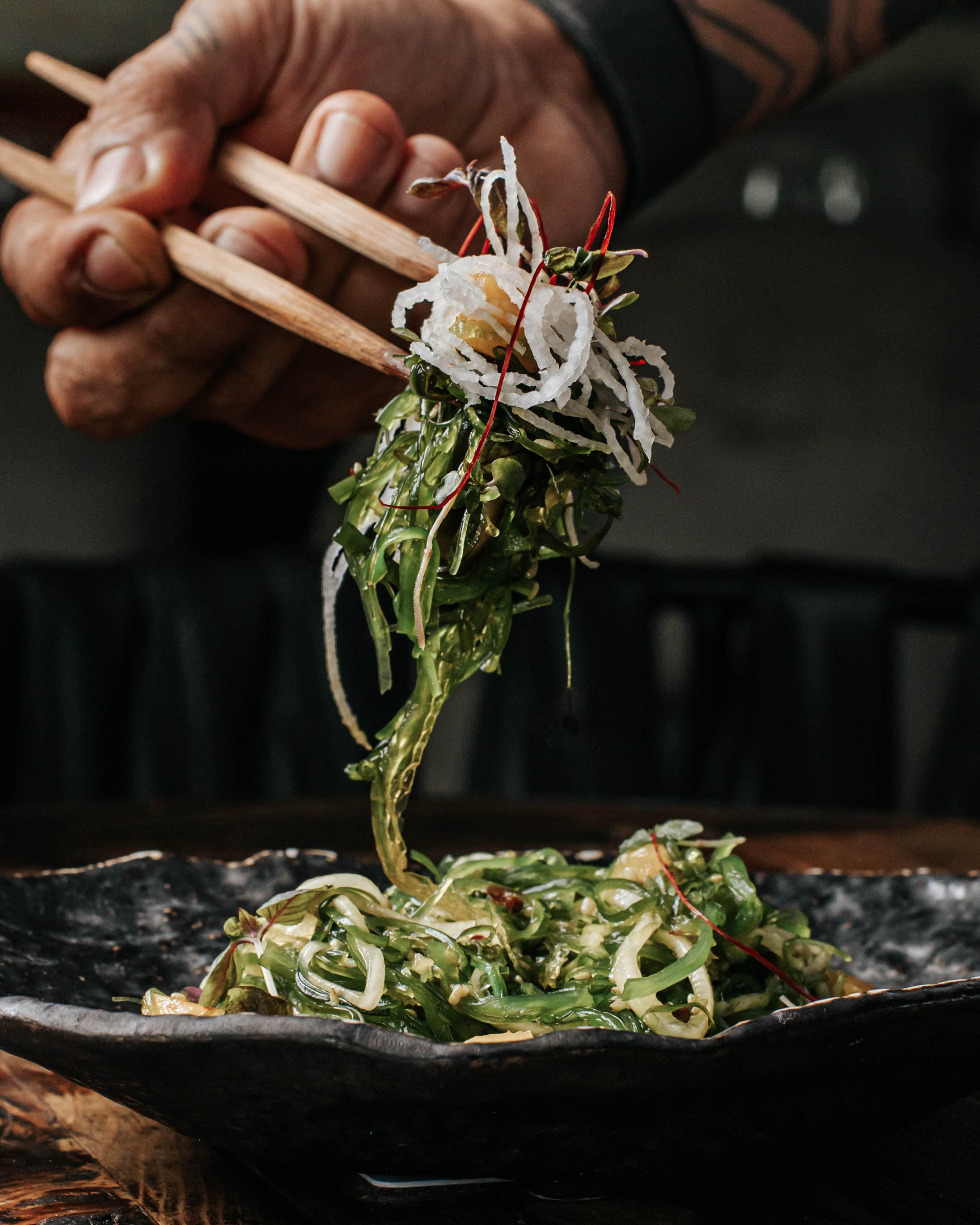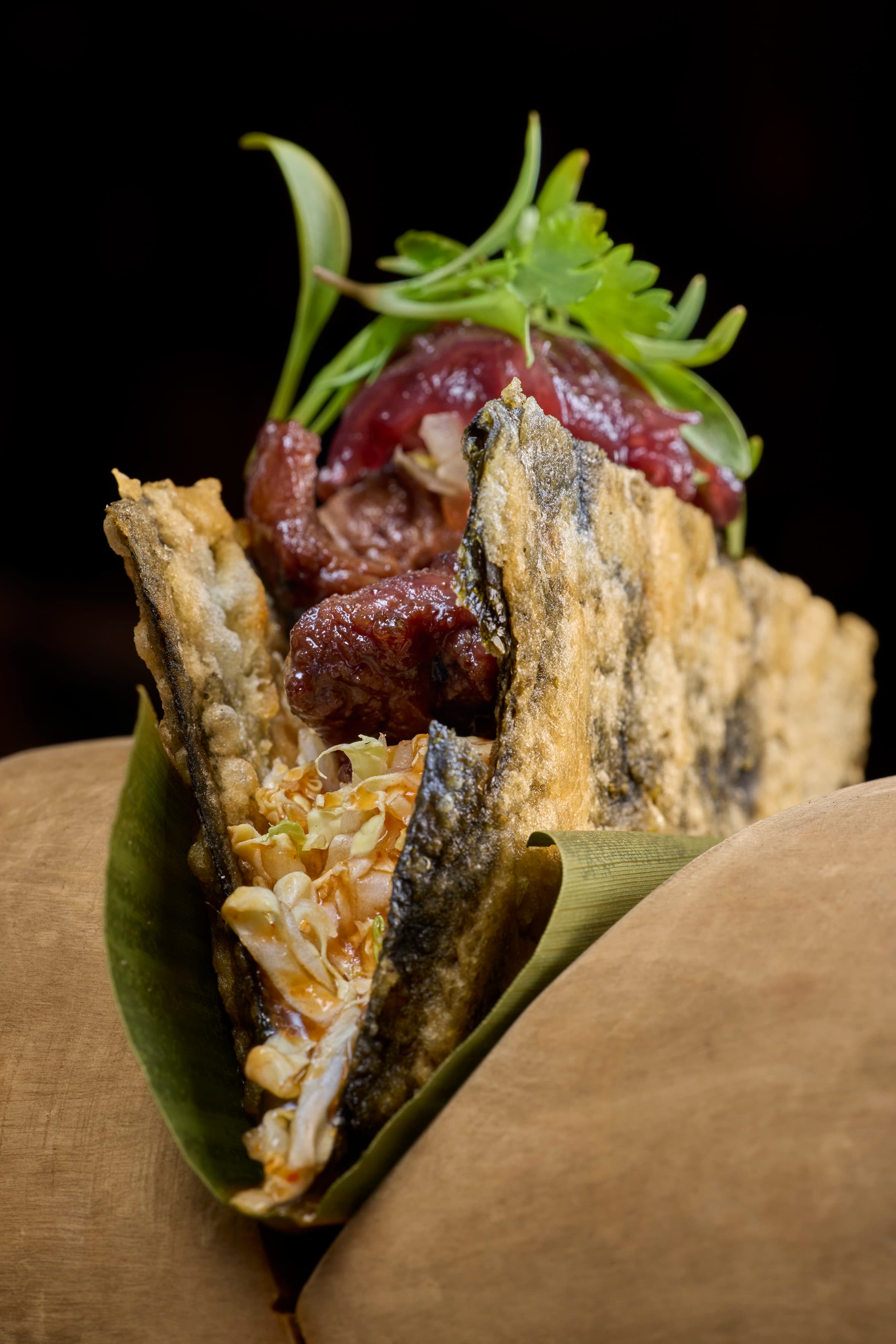 Wok-seared skirt steak with teriyaki, pico de gallo, yuzu gel, napa with kimchi and caramelized onion on crispy nori.