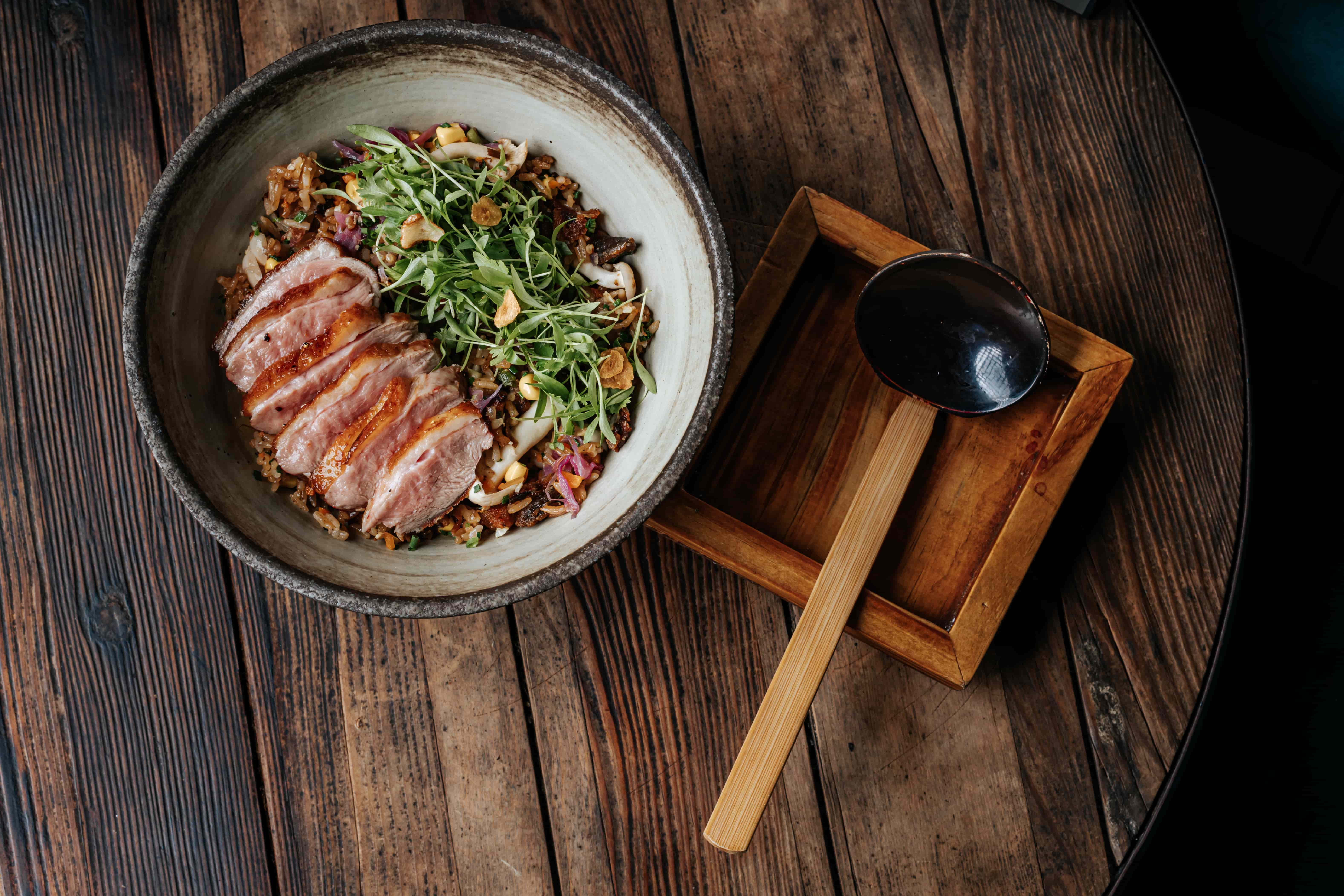 Wok-fried rice with mushrooms, seasonal vegetables and roast duck.