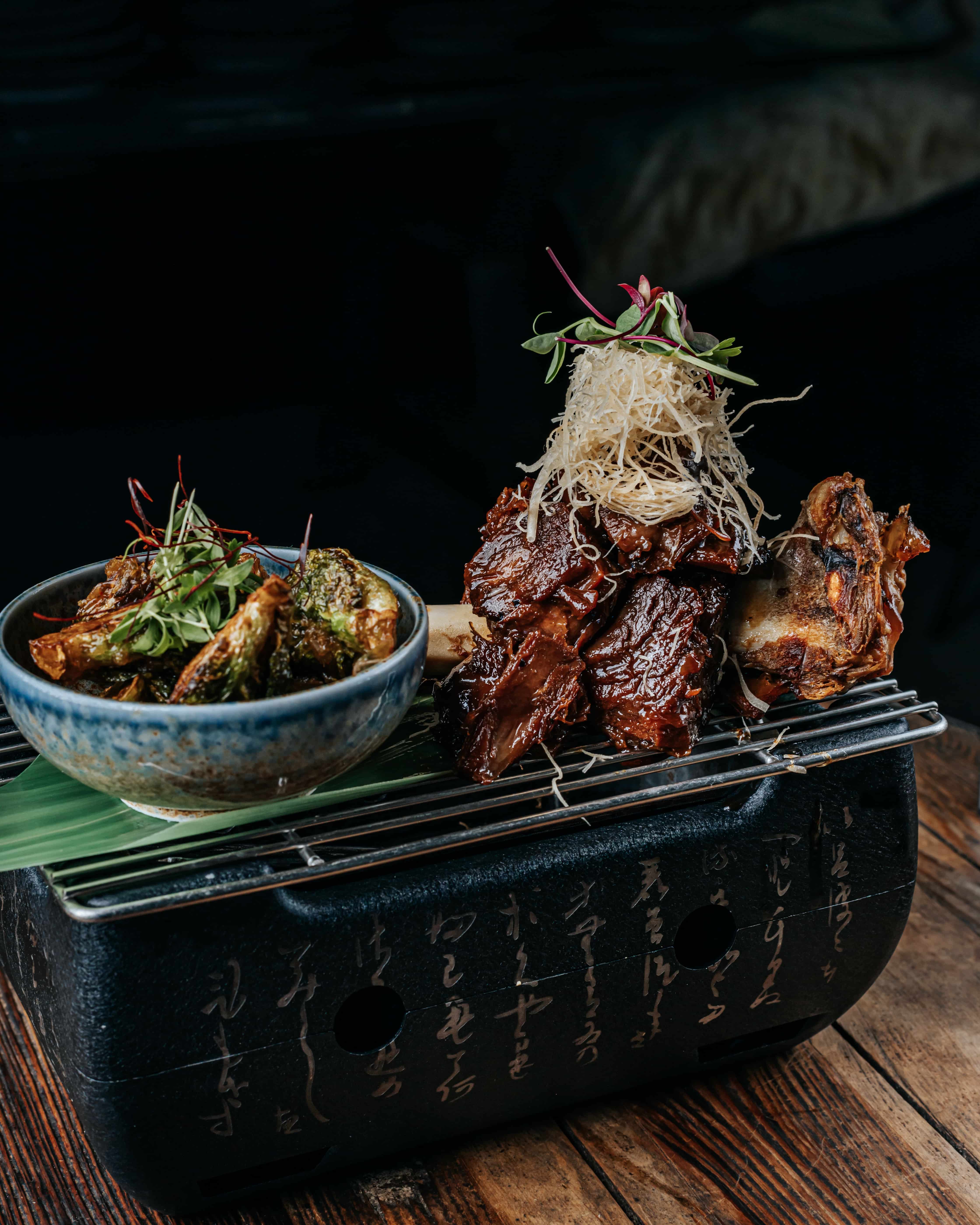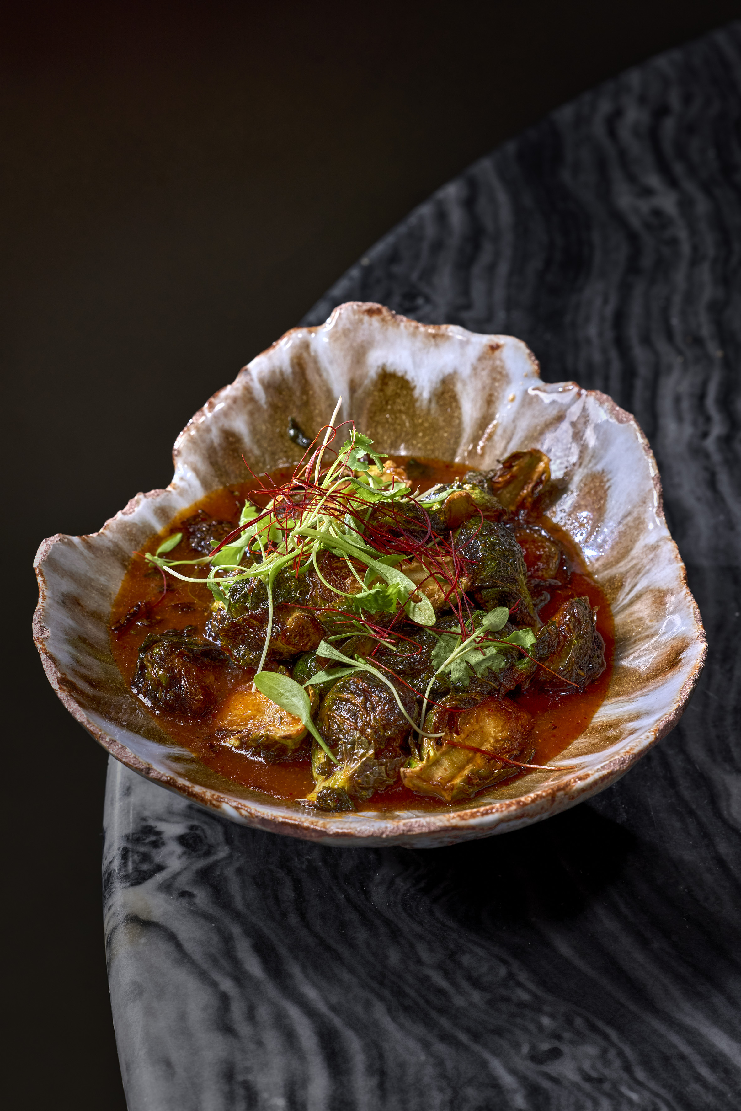 Teriyaki sauce-glazed lamb, crispy wonton, served with Brussels sprouts in kimchee sauce.
