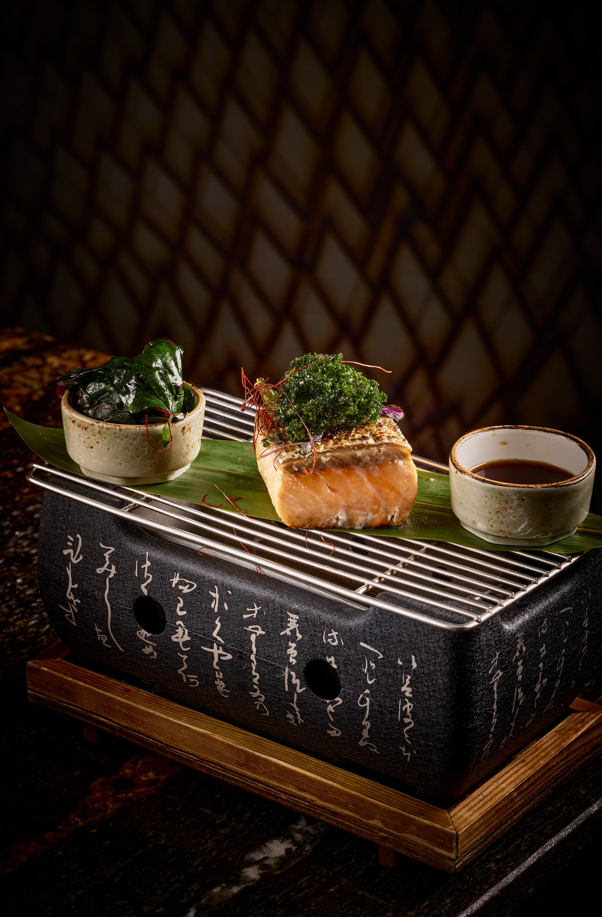 Ponzu-glazed salmon grilled on the robata, served with bok choy and soy seasoning.