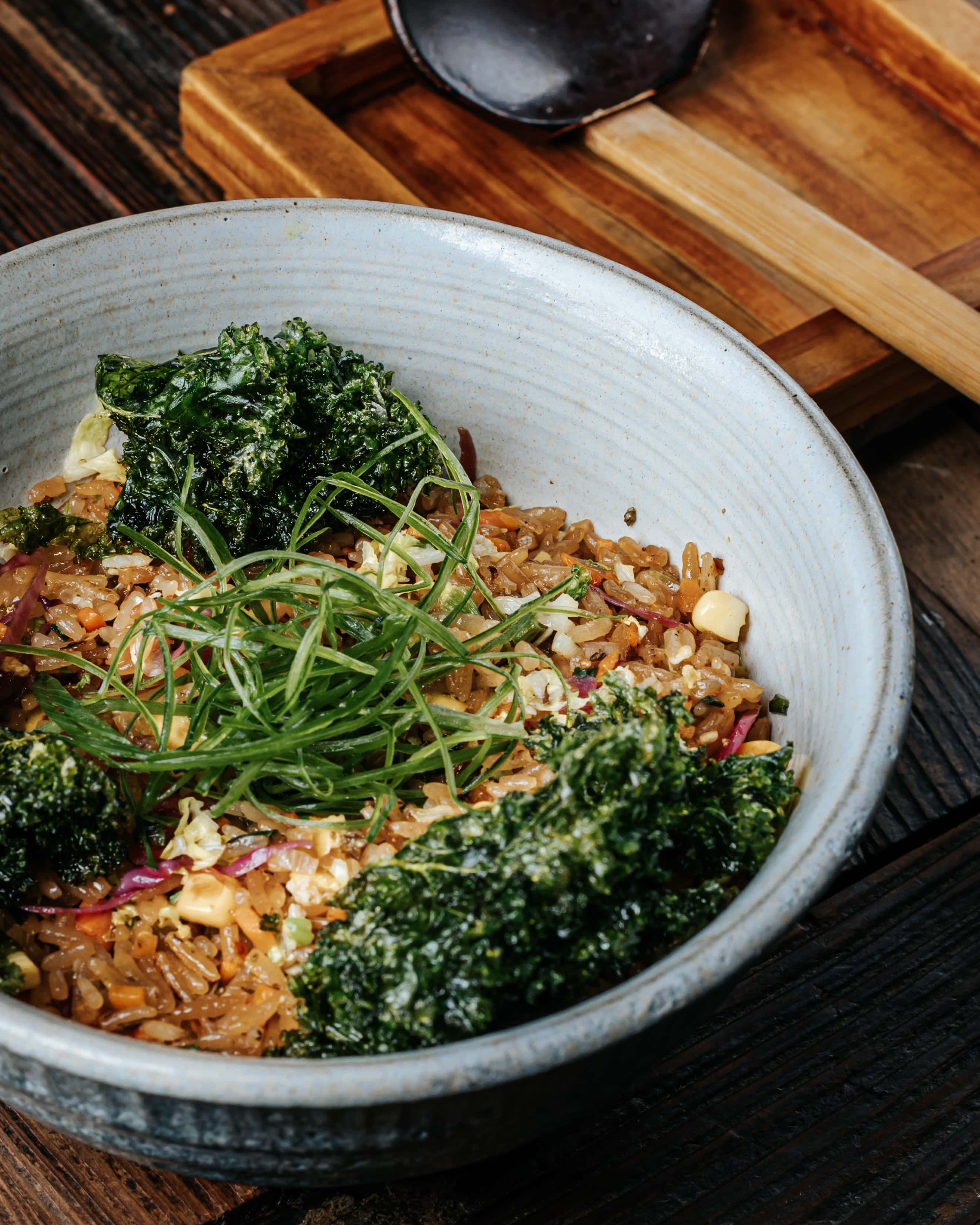 Wok rice with corn, cauliflower, green onion and pickled red cabbage.