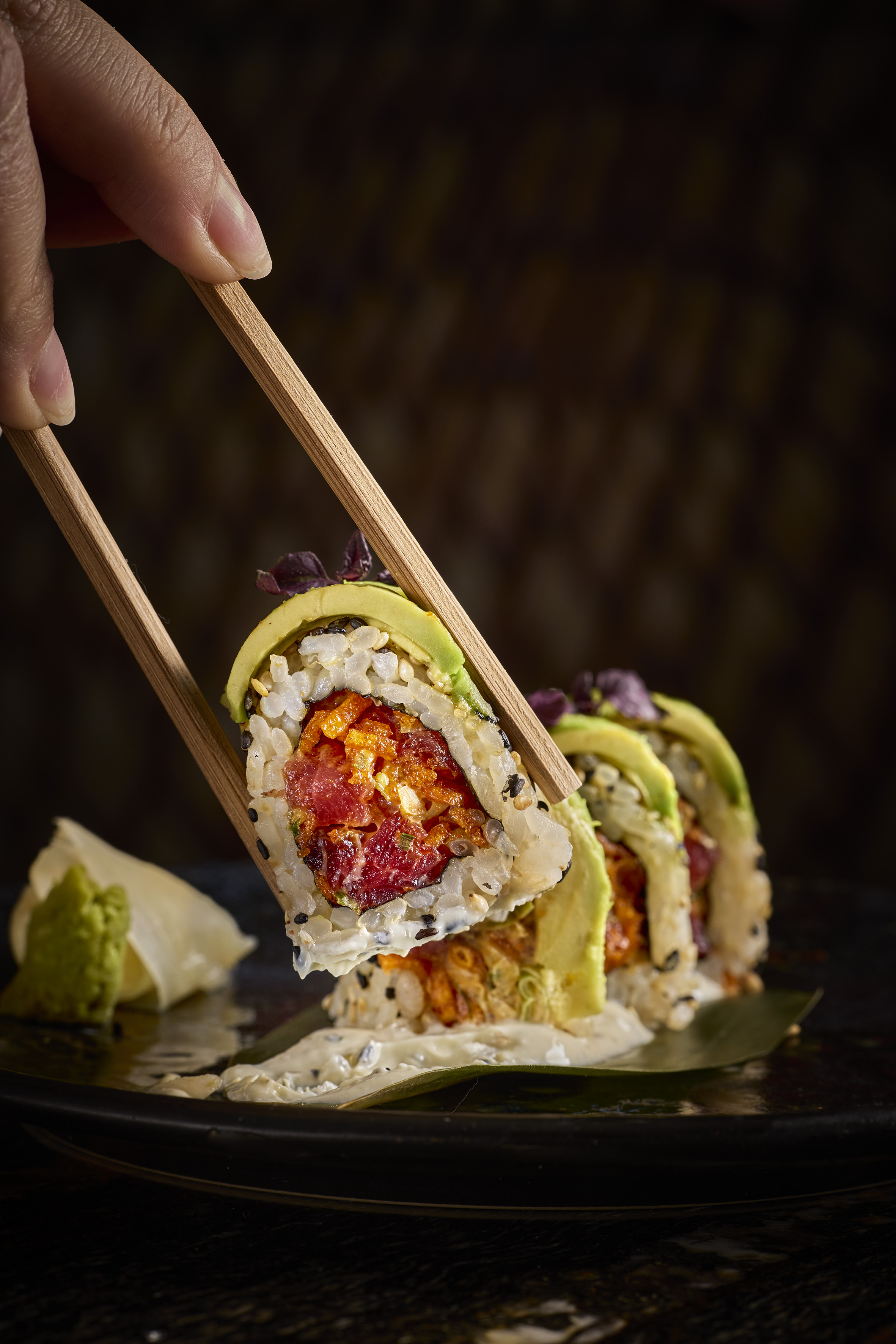 Tuna, mayo garlic ponzu, avocado and tempura flakes.