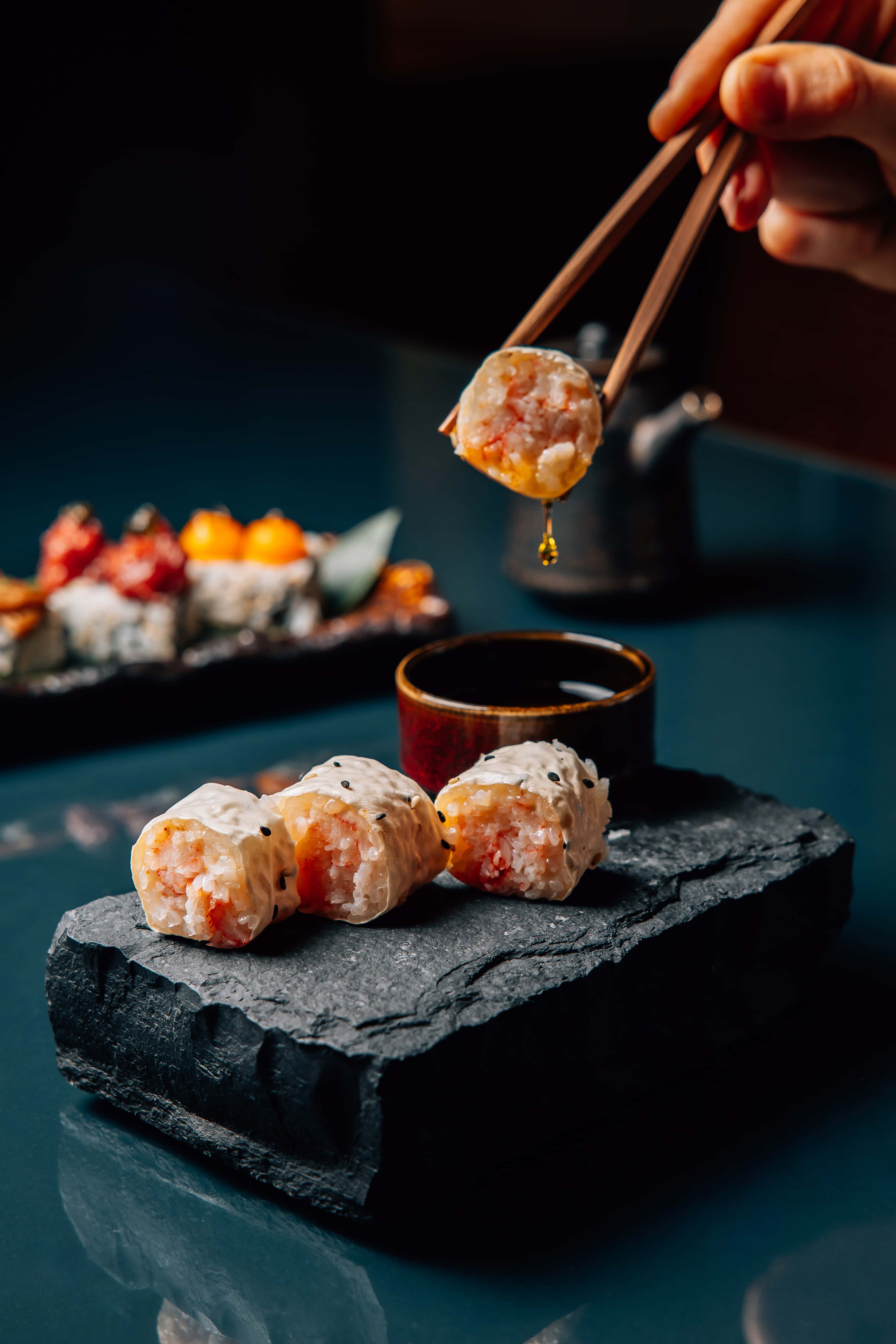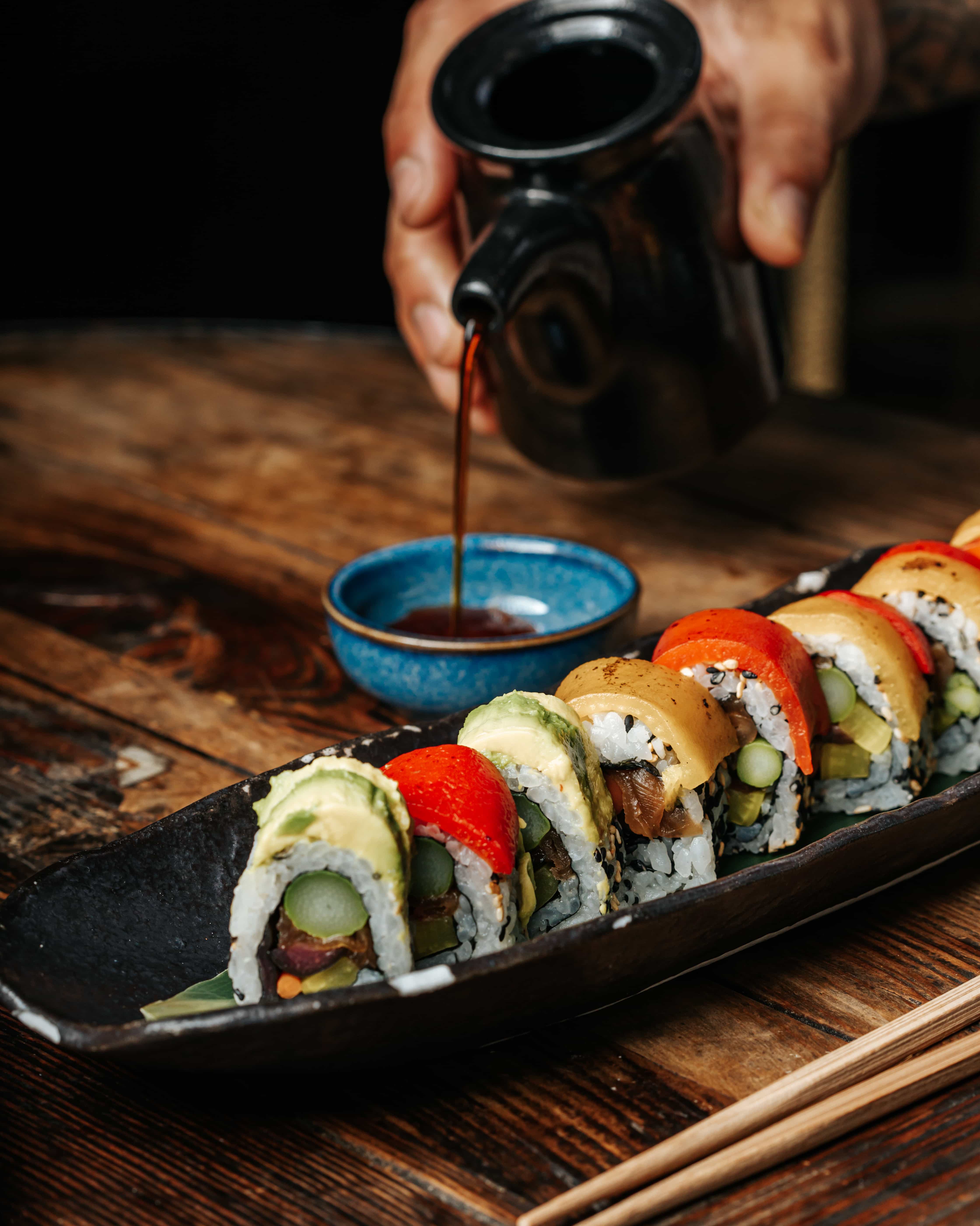 Selection of Rolls that includes 4 types: Vegan Roll, Wagyu Roll, Spicy Tuna Roll and Shrimp Roll (4 pieces each), an assortment of Octopus, Hotate and Salmon Sashimis (2 pieces each type) and a set of Nigiris with Crayfish, Ika and Unagi (2 pieces of each type). + 30gr Caviar