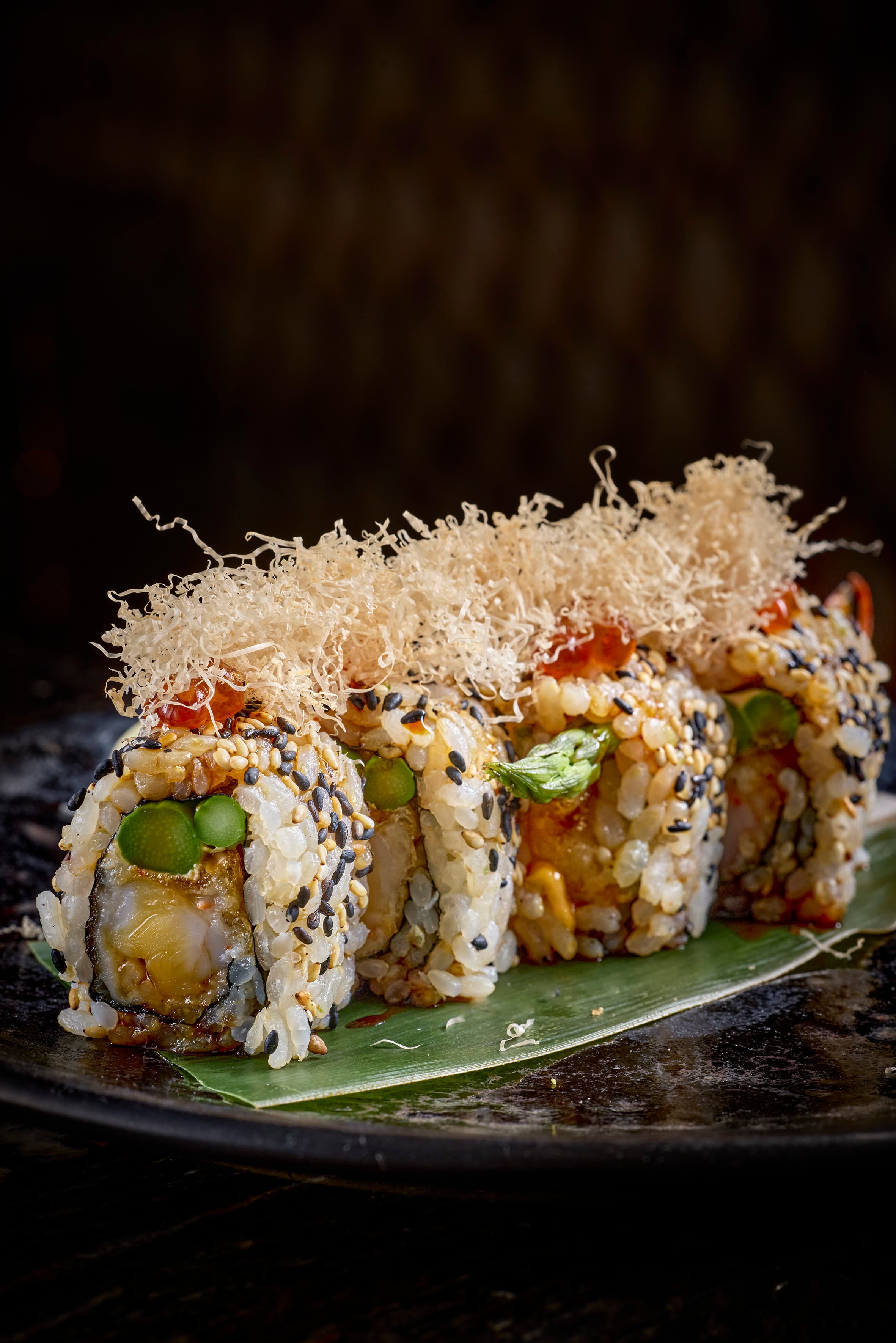 Maki filled with snow crab, scallions, and tempura shrimp, topped with eel and flamed foie gras. 8 pcs.