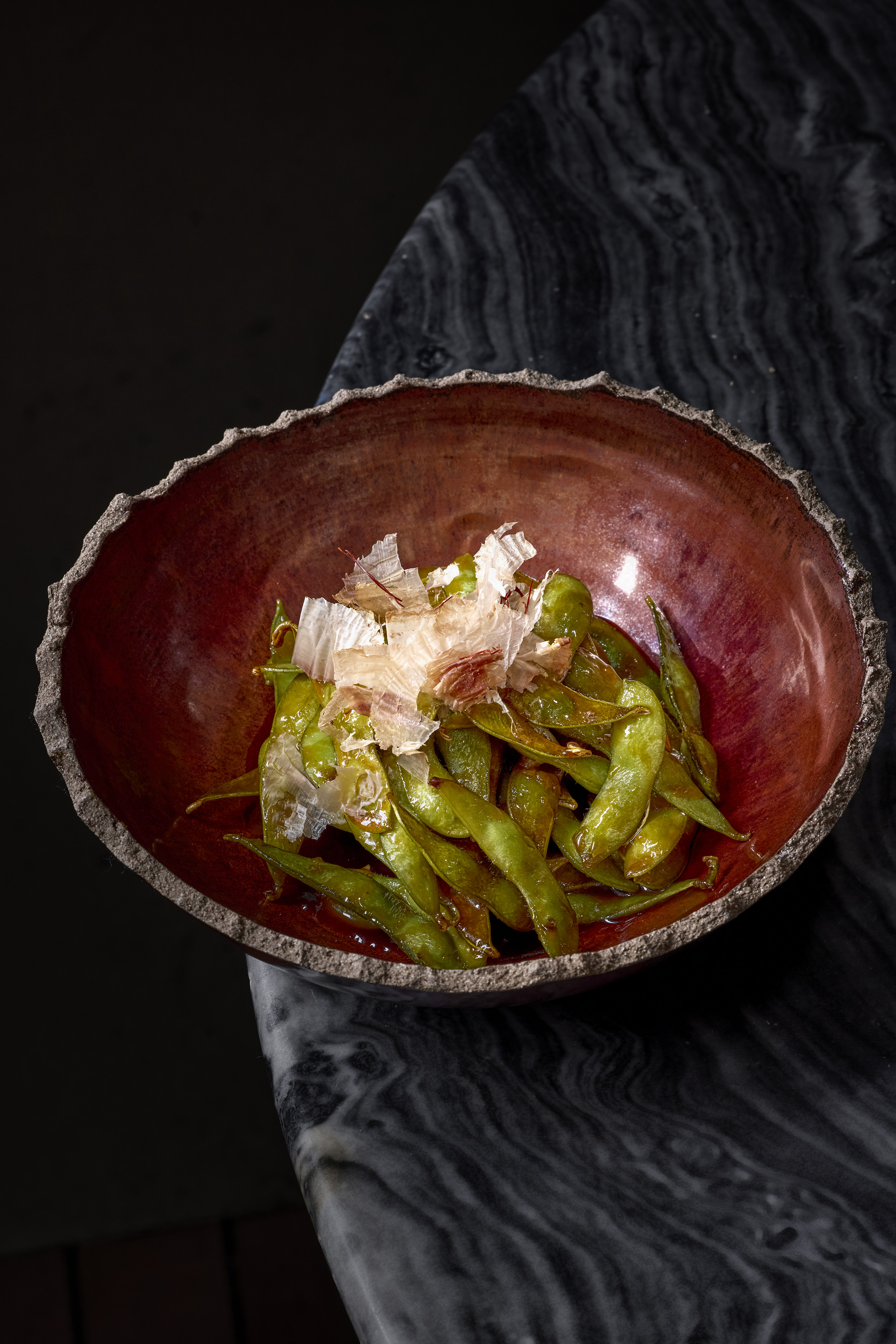 Glazed edamame in sakura sauce, chili threads and katsuobushi.