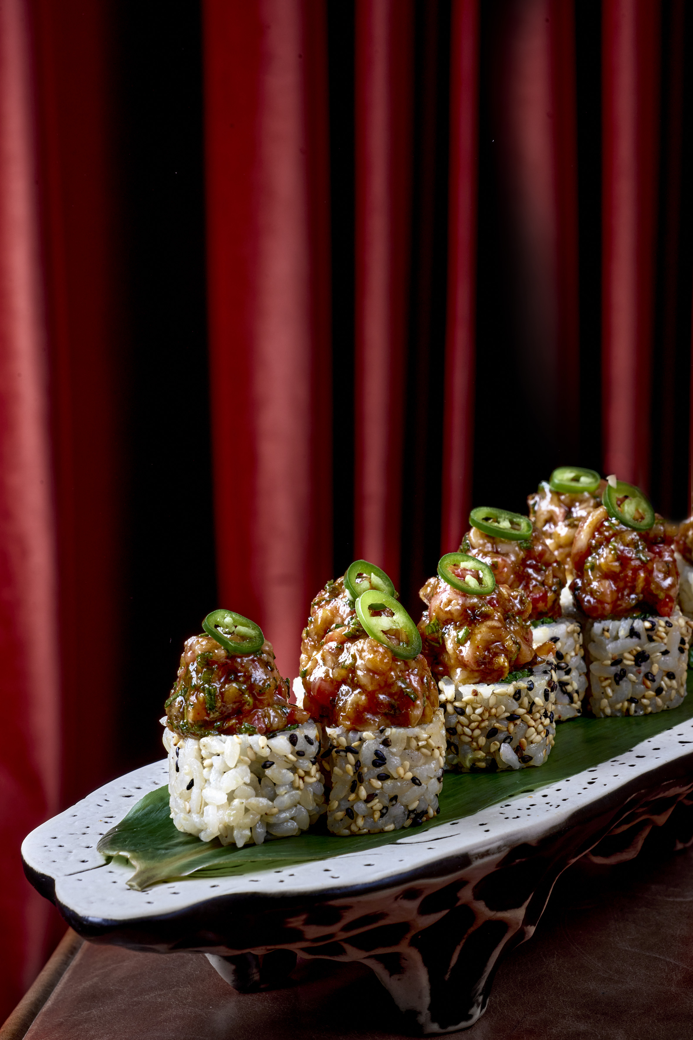 Flamed salmon, sesame, and avocado. Topped with flambéed hamachi, serrano pepper, and tobiko. Served with kimchi sauce. 8pcs.