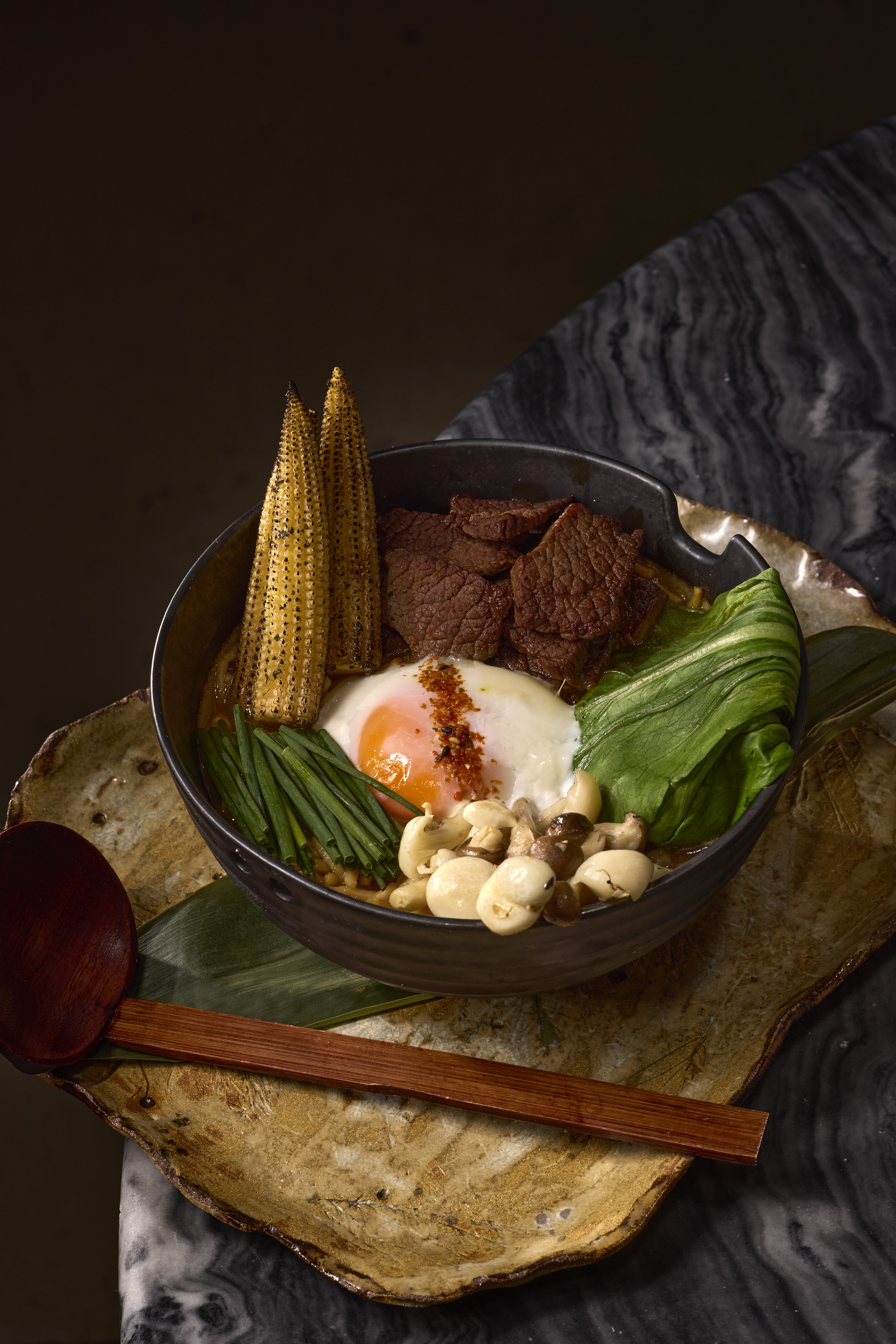 Fresh noodles, beef, poached egg, spring onion, baby corn, pak choi and shimeji mushroom.