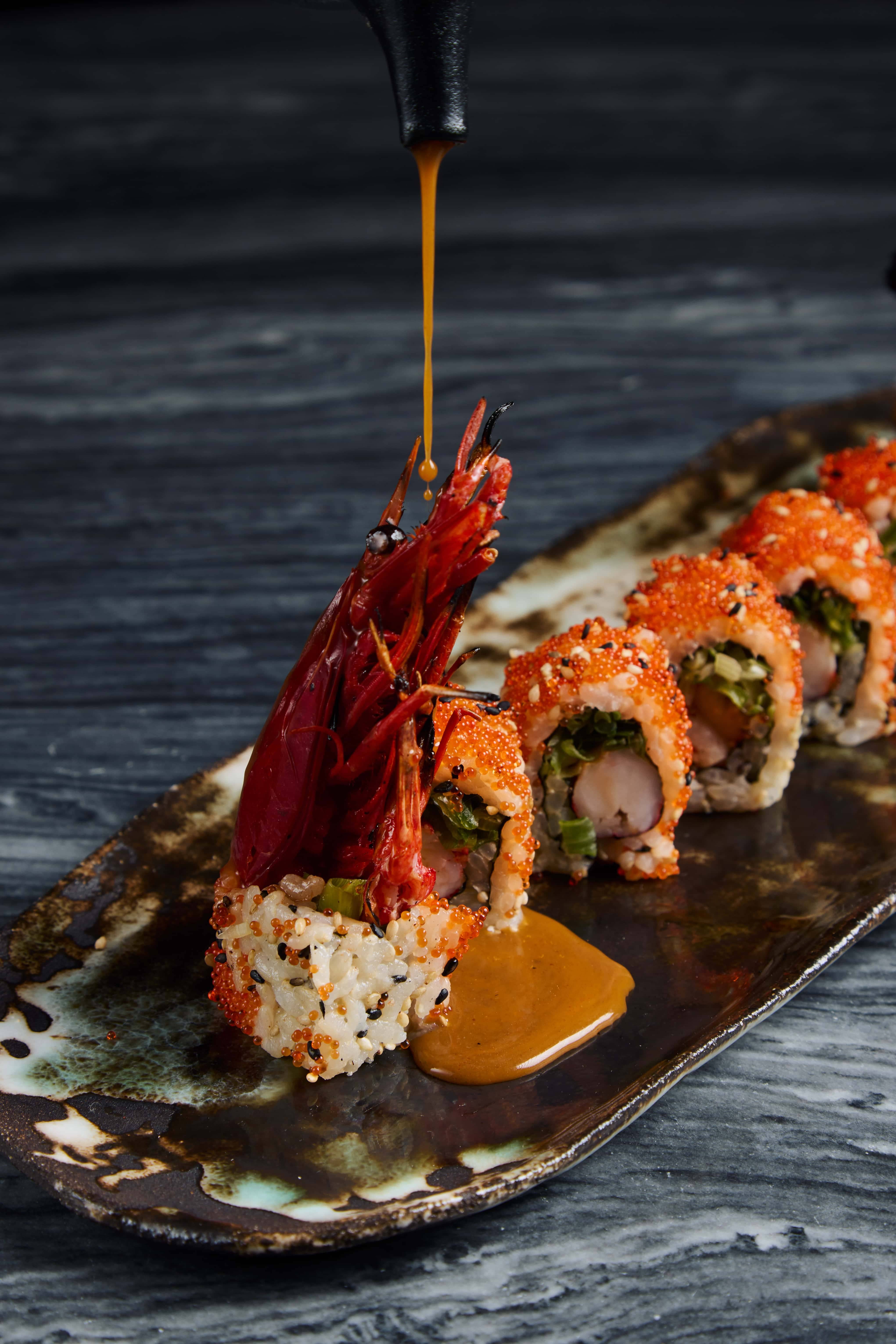 Snow crab, chives, lettuce and avocado, with tobiko and gochujang-tempured and frosted lobster topping. 8 pcs.