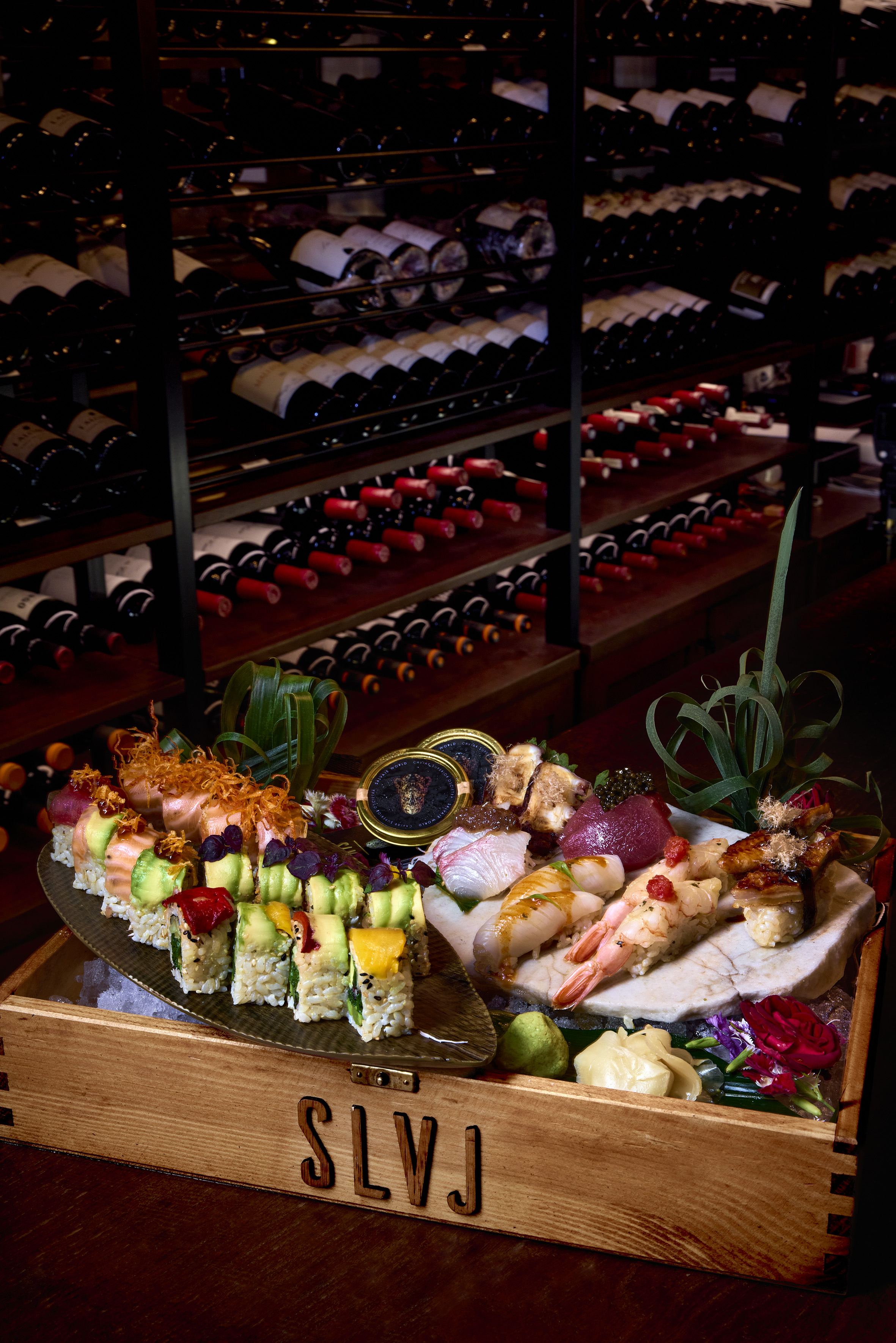 Selection of Rolls including 4 types: Vegan Roll, Wagyu Roll, Spicy Tuna Roll, and Shrimp Roll (4 pieces each), assorted Sashimi of Octopus, Hotate, and Salmon (2 pieces of each), and a Nigiri set with Scampi, Ika, and Unagi (2 pieces of each) + CAVIAR.